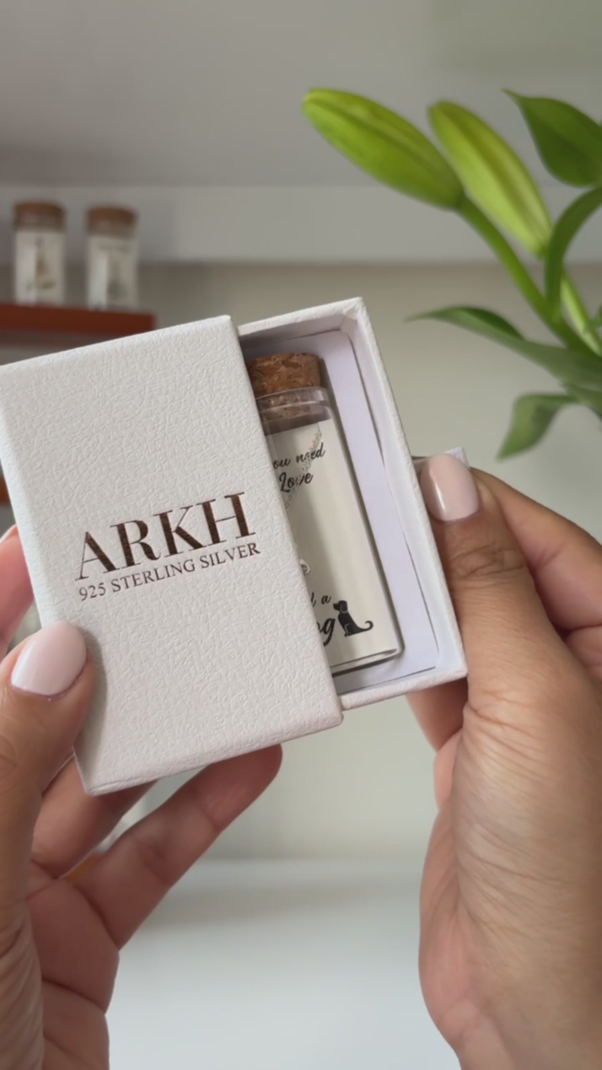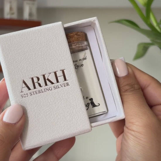 925 sterling silver necklace presented as a message-in-a-bottle. The card reads "All you need is Love and a Dog" and features an original illustrated design. Delivered as a complete keepsake set of bottle, card, and jewellery.