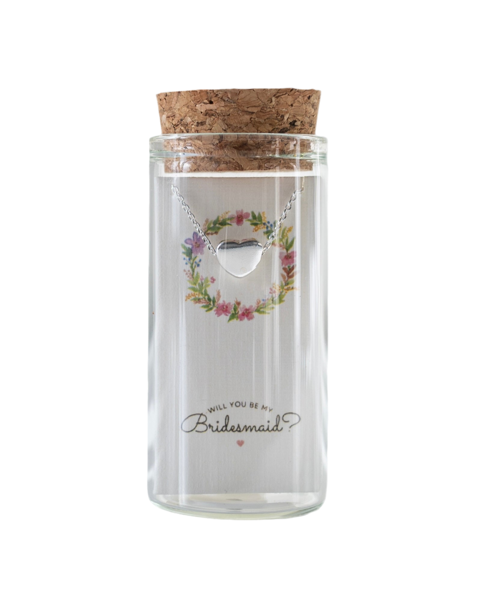925 sterling silver necklace presented as a message-in-a-bottle. The card reads "Will you be my Bridesmaid?" and features an original illustrated design. Delivered as a complete keepsake set of bottle, card, and jewellery.