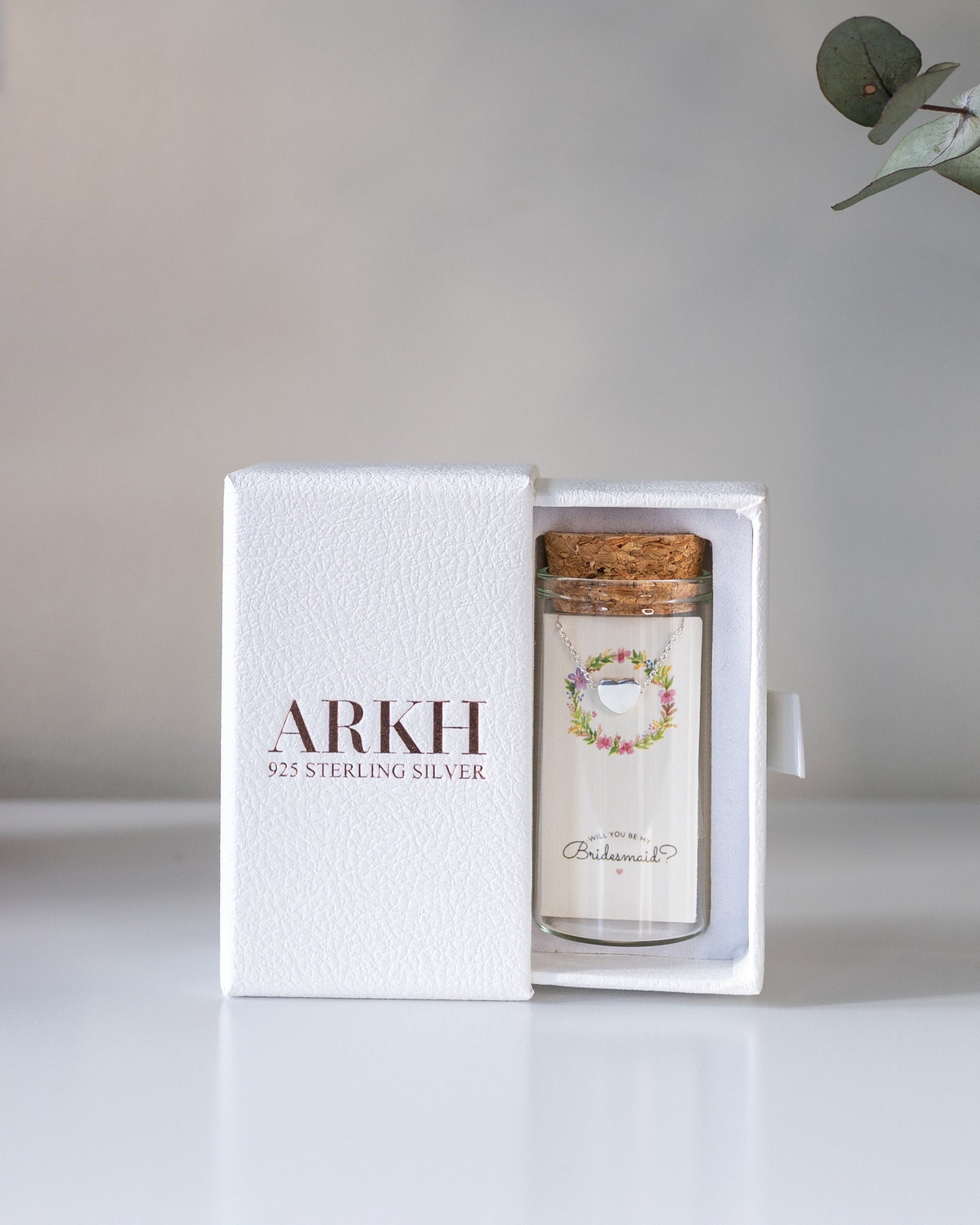 925 sterling silver necklace, presented as a message-in-a-bottle keepsake. The card reads “Will you be my Bridesmaid?” with exclusive original artwork. Thoughtfully packaged — a gift that’s premium and sustainable.
