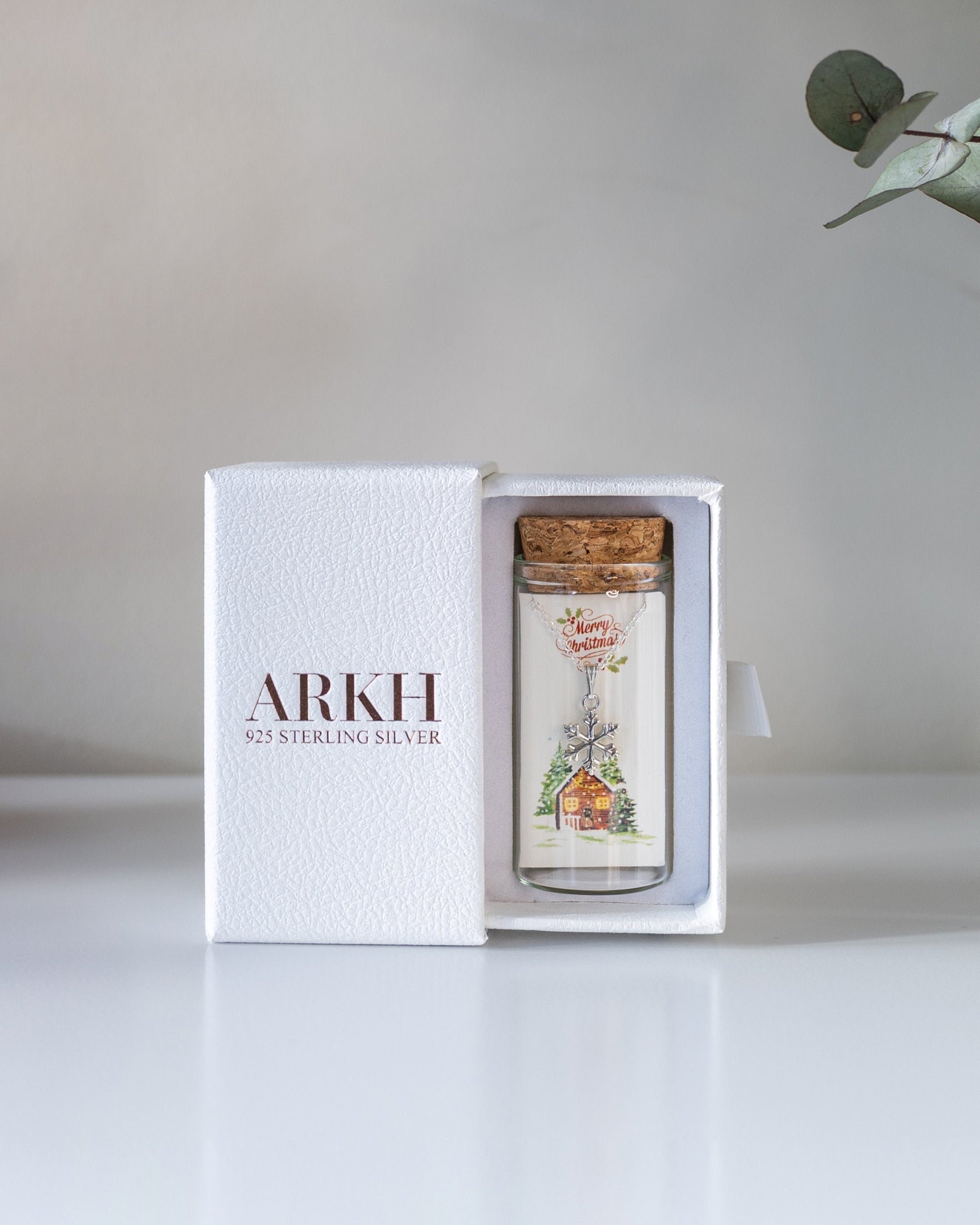925 sterling silver necklace, presented as a message-in-a-bottle keepsake. The card reads “Merry Christmas!” with exclusive original artwork. Thoughtfully packaged — a gift that’s premium and sustainable.