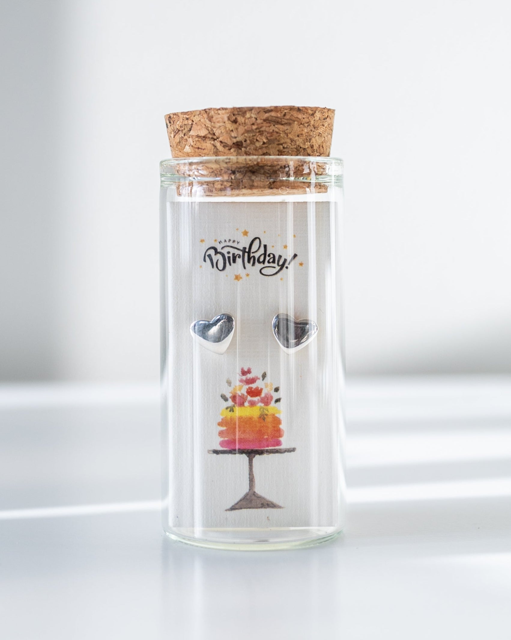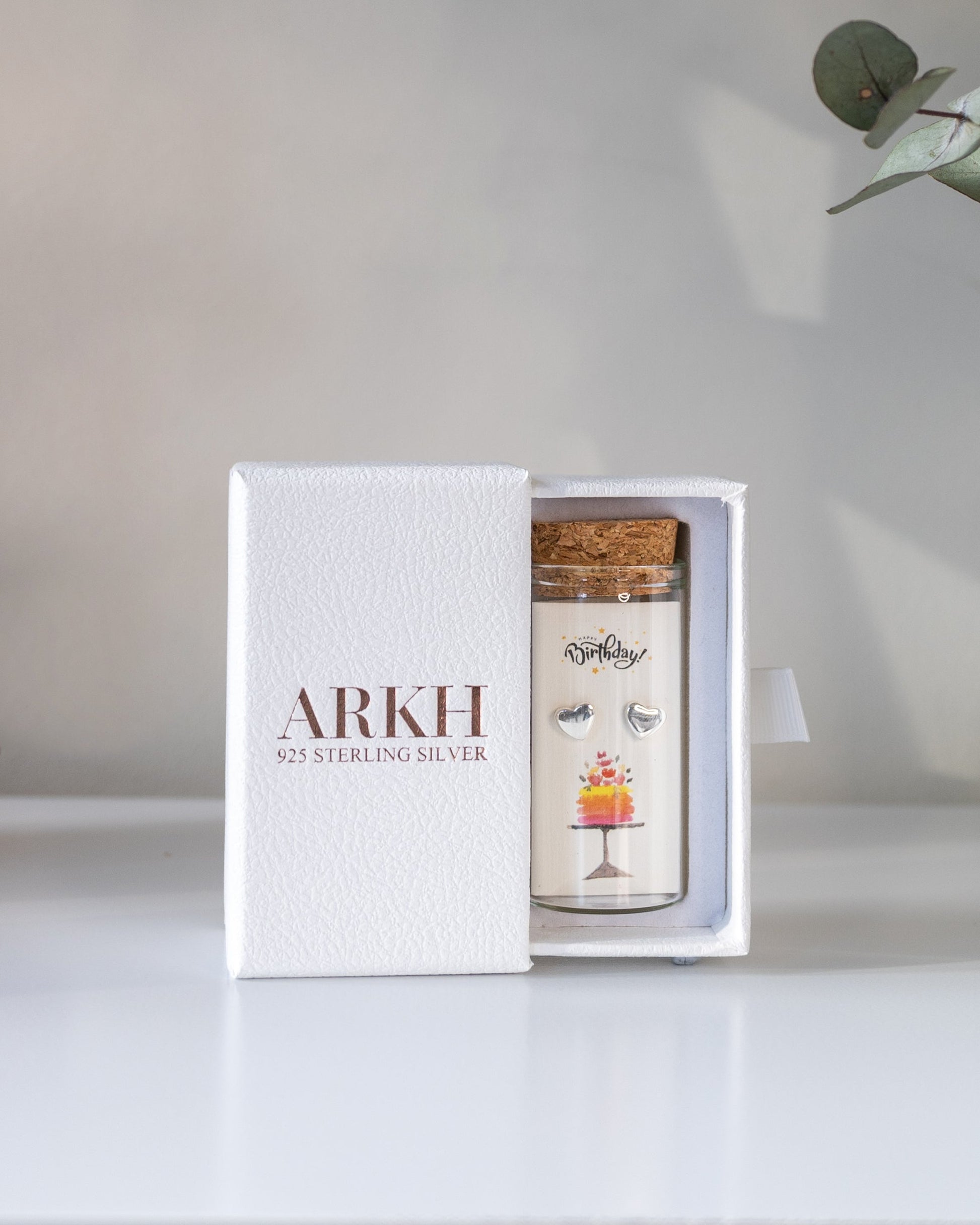 925 sterling silver studs, presented as a message-in-a-bottle keepsake. The card reads “Happy Birthday!” with exclusive original artwork. Thoughtfully packaged — a gift that’s premium and sustainable.