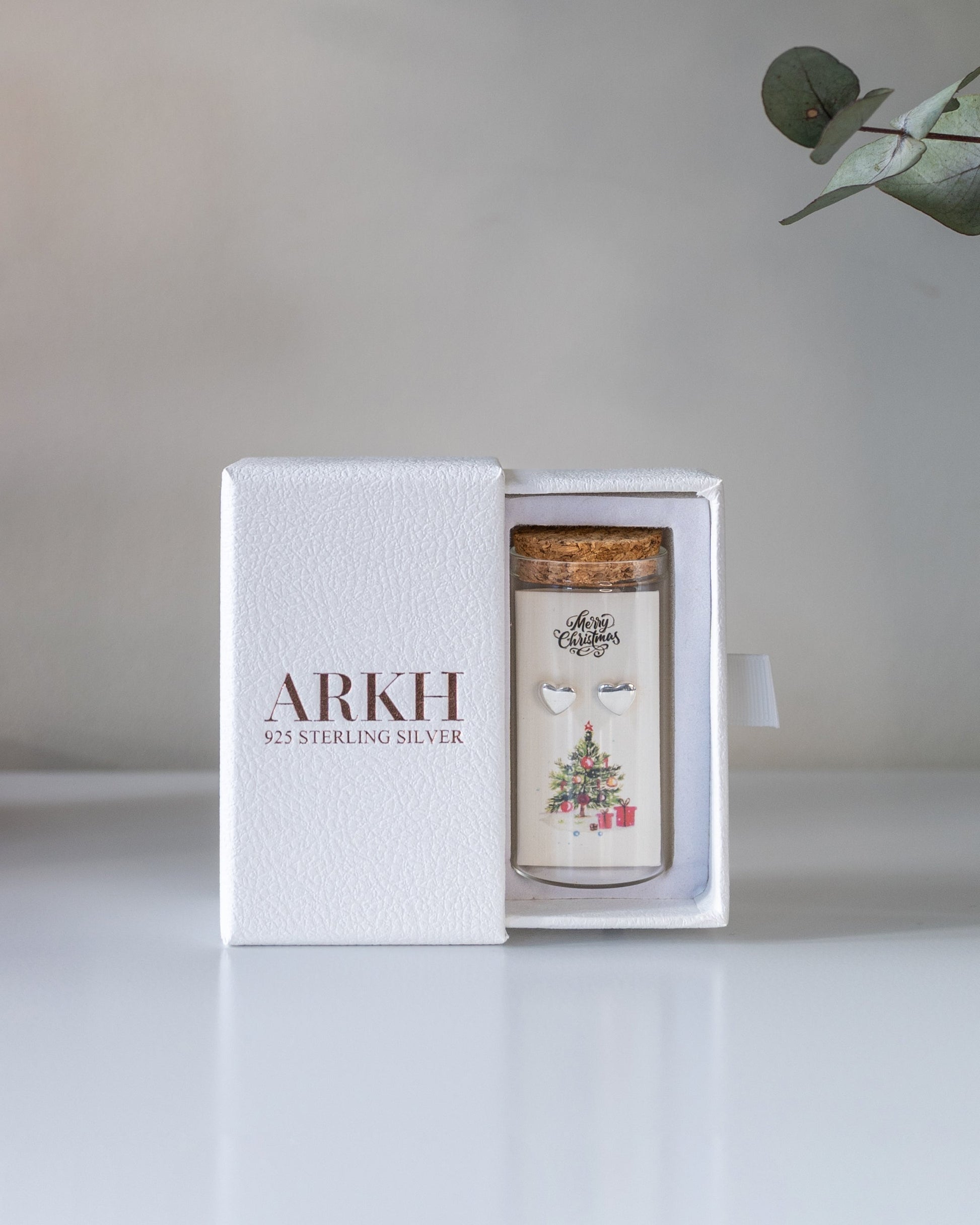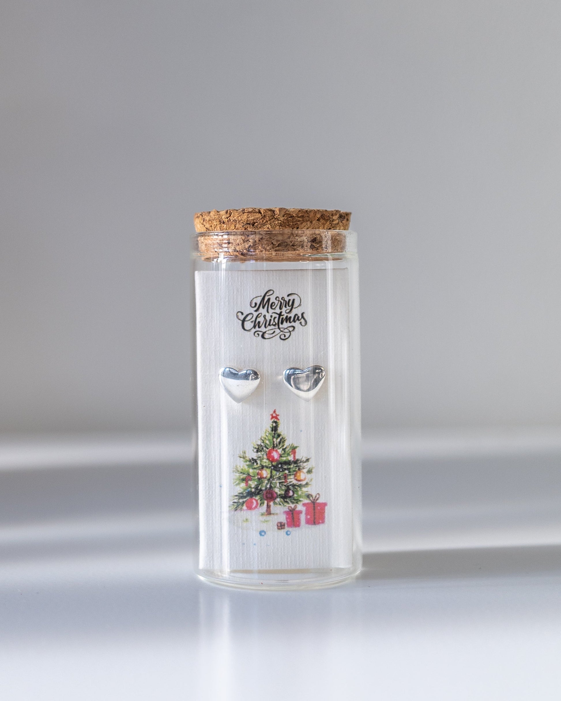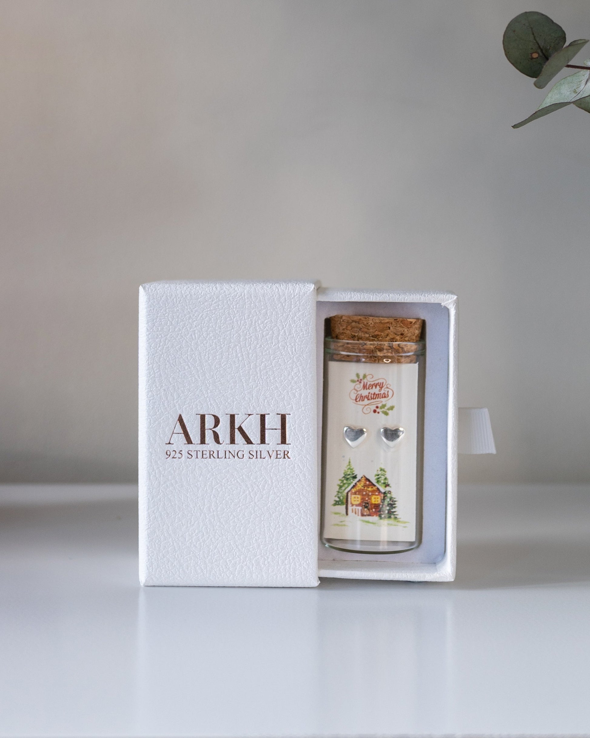 925 sterling silver studs, presented as a message-in-a-bottle keepsake. The card reads “Merry Christmas!” with exclusive original artwork. Thoughtfully packaged — a gift that’s premium and sustainable.